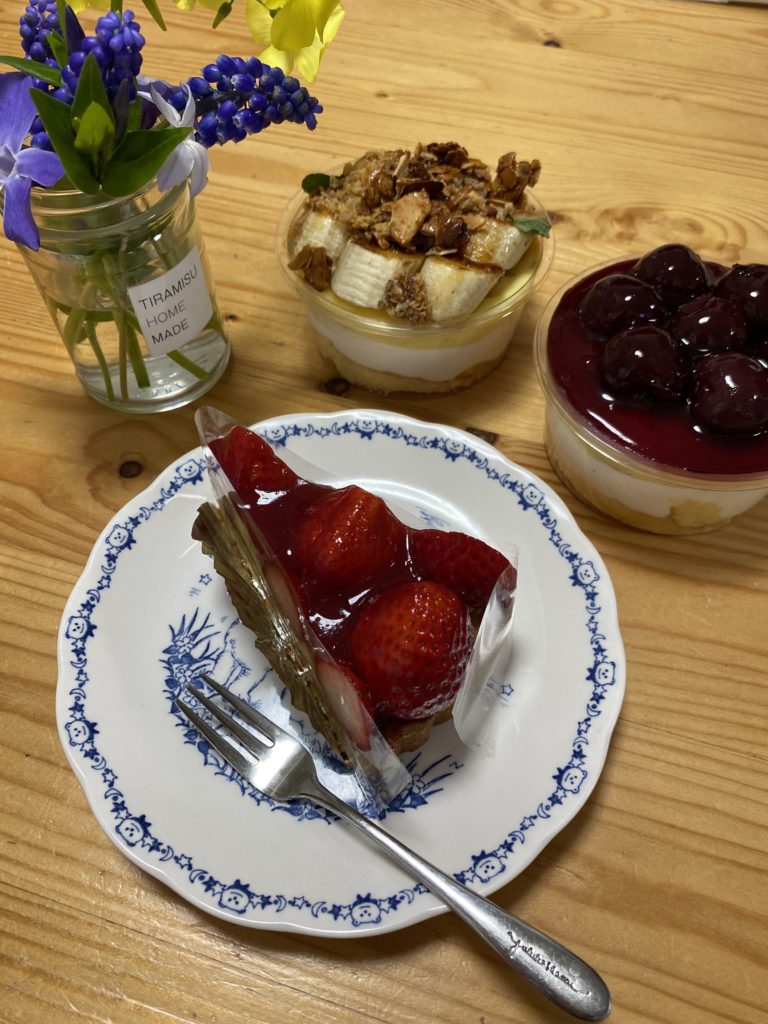 ケーキはテイクアウトして、帰りに散歩がてら、満開の桜を見ながら歩いて、少し腹ごなししてから 家でいただきました(食べすぎやろ!)