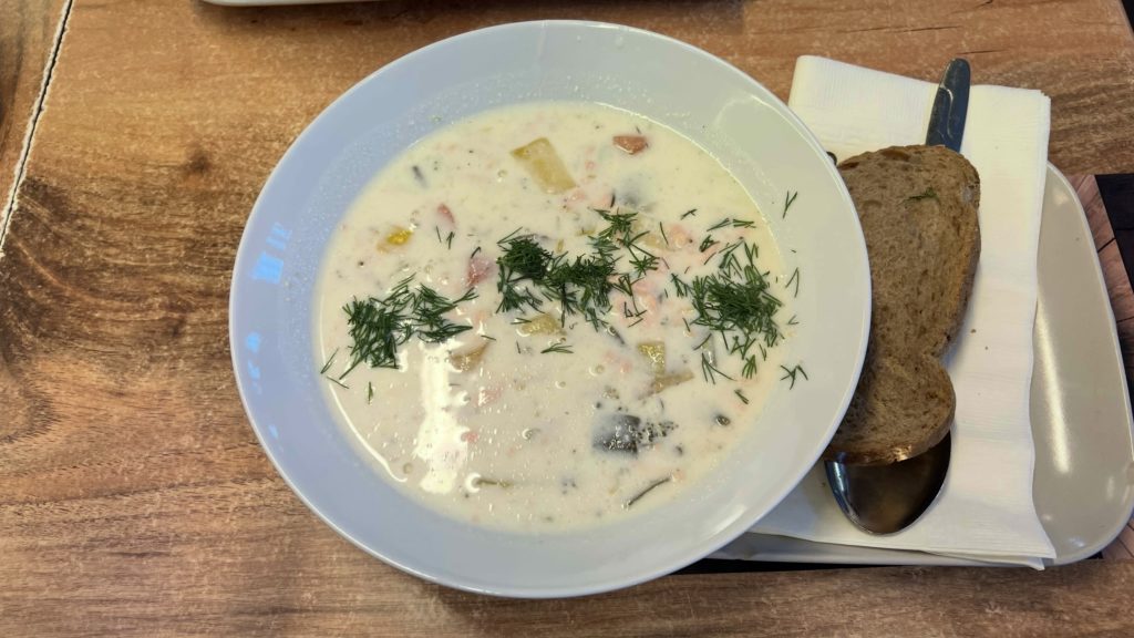 オールドマーケットでサーモンスープを食べる。名物とのこと。美味しかった❤️
