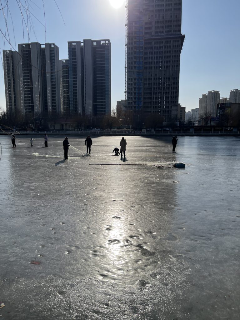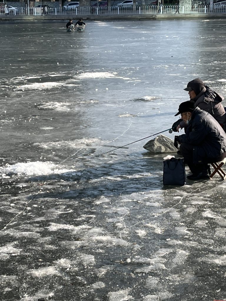 厚さもすごくて、でもその氷にどうやって穴を開けたか知りませんが(ドリルいるレベル)、魚釣りをしているおっちゃんたちもいました笑