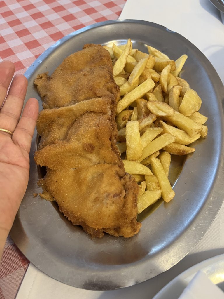といわれる。運ばれてきて納得、ポーションが多い!つけあわせのフライドポテトやマッシュポテトの量も半端ない。